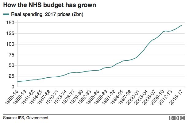 目前这个体系的支持者在那里反复聒噪、不绝于耳的说法是:保守党让医疗开支下滑至历史低位;将NHS恢复到它以前所能达到的成功水平,唯一要做的就是,把它的资金恢复到原先水平,或者他们所说的那个水平。但是,要相信这样一个声明,一个人不得不对统计数据犯下两个独立误解。这两个错误是如此基本,连学数学的高中生都会为之脸红:首先,在2010-18年保守党执政时期,下降的不是NHS支出的绝对数额,只是增长速度——在这个速度上,花费持续增长,即使按通胀率调整,也是如此。其次,增长速度下降的唯一原因,是1997-2010年以乱花钱而臭名昭著的工党政府,导致这个数字一直高得离谱。