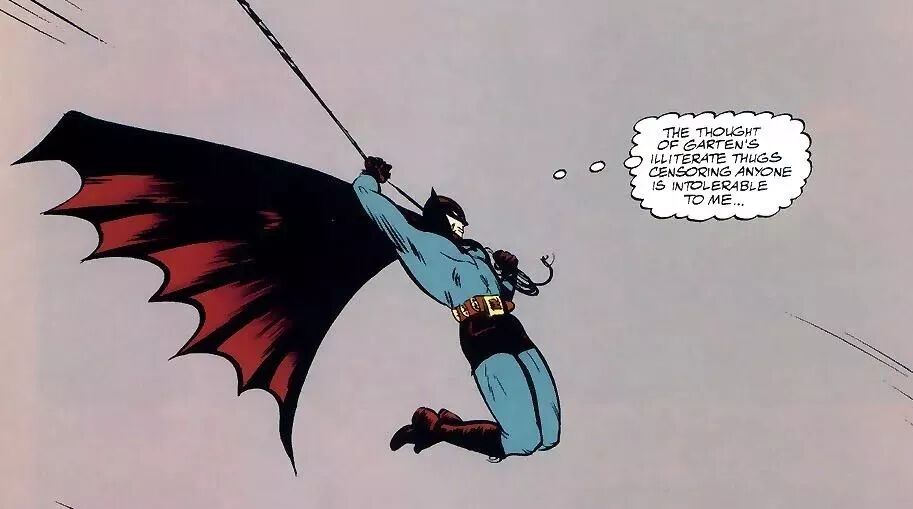 遇见加登的第二晚,韦恩穿上蝙蝠衫,直奔火车站,想要偷偷取回米塞斯的作品。他设法阻止火车,但被加登的手下围困。于是他毁掉火车,好让米塞斯的作品和思想,不至于落入坏人之手。