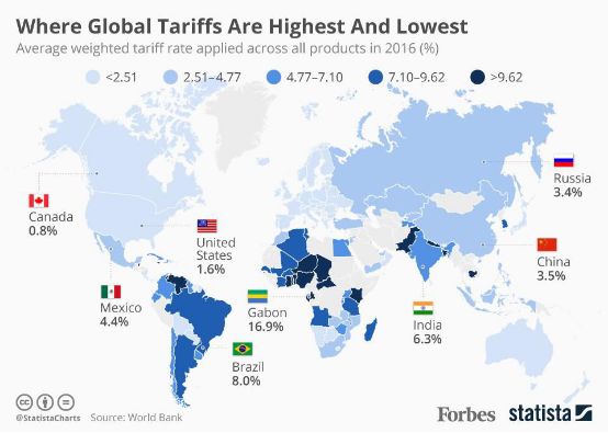 在解析之前,请先看一下2016年加权平均关税世界地图。