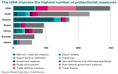 上图显示:美国的贸易保护措施数量最多(接下来依次是印度、俄罗斯、巴西、中国、欧洲和日本)