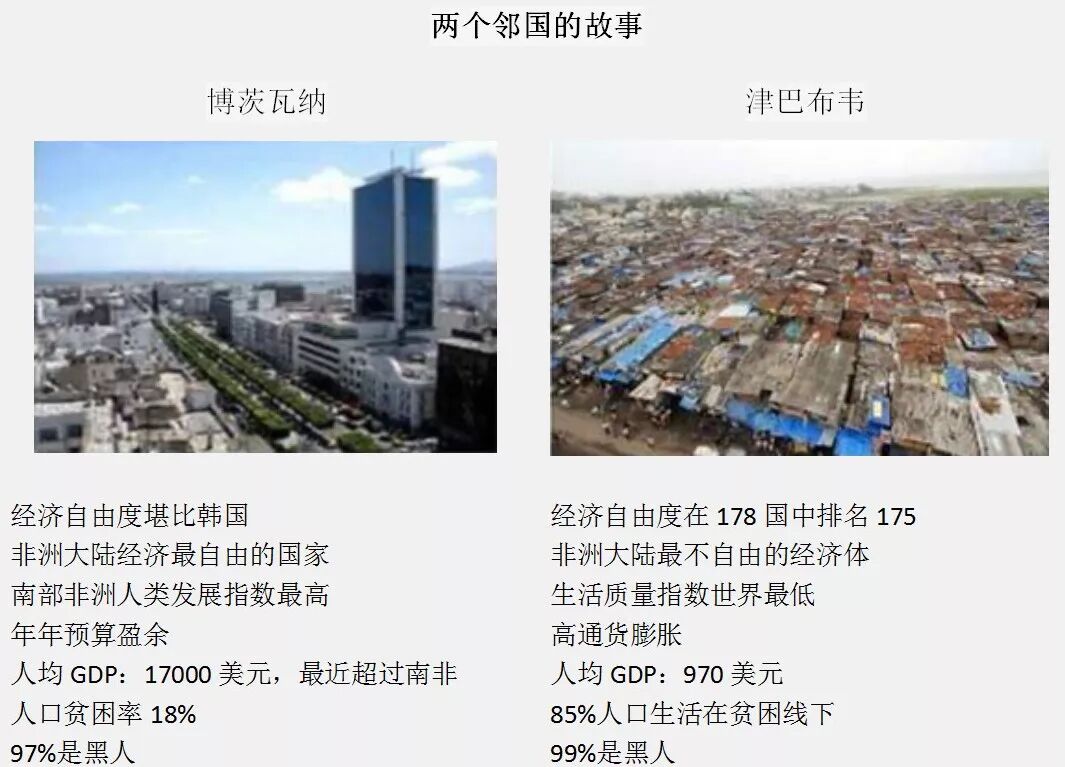 “我认为,津巴布韦与博茨瓦纳之间一个天上,一个地下,后者享有安全保障,日益走向繁荣。但是,两个邻国间这种惊人的巨大差异,是什么造成的呢?事实证明,大部分差异,都源于每个民众享有的自由度。”