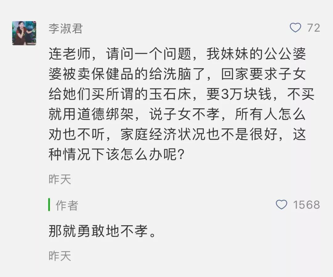 所以,最好的应对就是,我只按自愿、只按道理行事,不认你那套孝的话语体系,为你买3万块的保健玉石床?没道理,我不愿意,你说我不孝?那我就不孝。